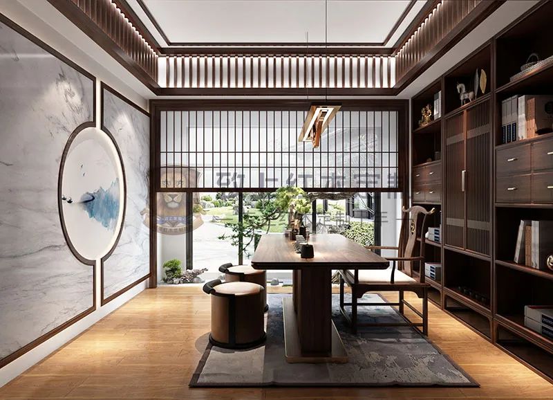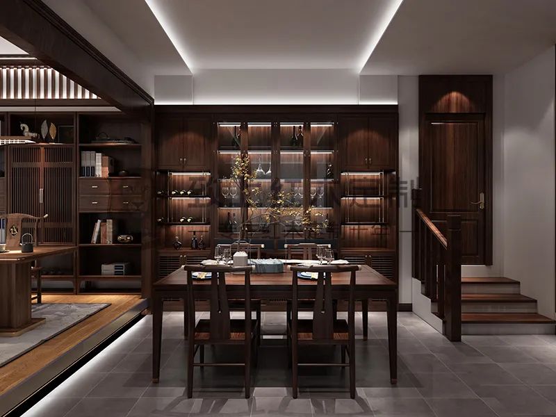 以現(xiàn)代中式風(fēng)格桌椅為主場景,以樣式獨(dú)特精致的通頂柜作為收納茶具茶葉、書籍藏品的所在,三五知己、親朋好友,在這里有悅目娛心的樂趣,也有寧靜致遠(yuǎn)的格局。